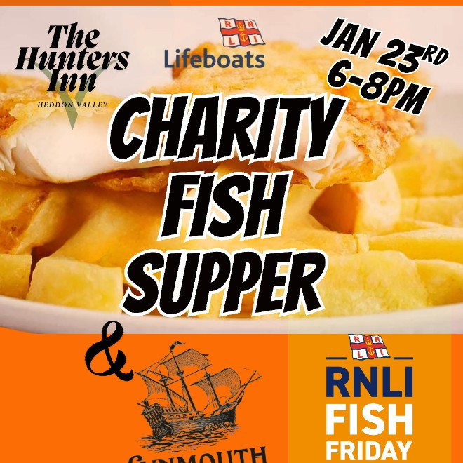 Join us for a Fish Supper with live music from 7pm with The Lynmouth Shanty Crew to help selfless RNLI volunteers save lives this summer! 6-8pm January 23rd 2026, at The Hunters Inn Heddon Valley.